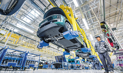 長(zhǎng)江經(jīng)濟(jì)帶生產(chǎn)制造和出口的新能源汽車日漸成為中國(guó)出口的“金名片”。圖為一家車企江蘇常州基地的工人在加緊生產(chǎn)。