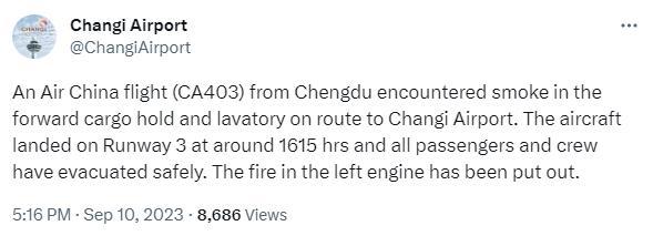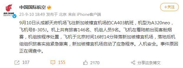 另據(jù)中國國際航空官方微博消息,10日從成都天府機(jī)場飛往新加坡樟宜機(jī)場的CA403航班在著陸前出現(xiàn)客艙煙霧,機(jī)組按程序處置,飛機(jī)于北京時間16時14分降落新加坡樟宜機(jī)場,落地后機(jī)組組織旅客實施緊急撤離,新加坡樟宜機(jī)場啟動了應(yīng)急程序。人機(jī)安全。事件原因正在調(diào)查中。