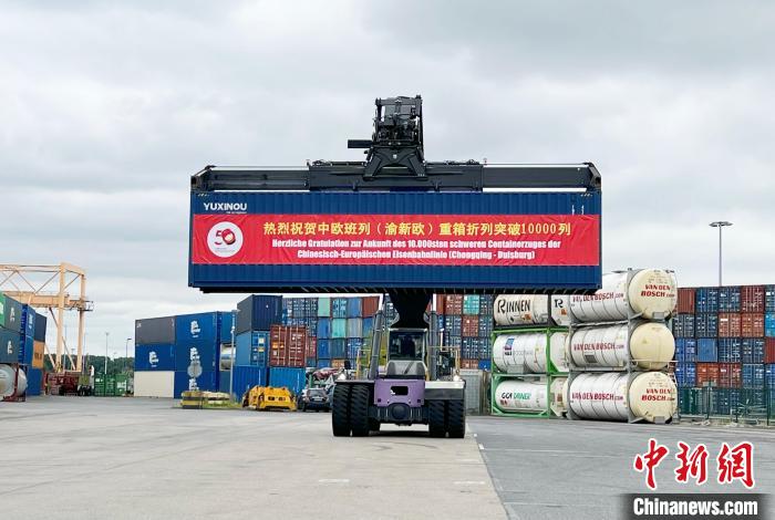 2022年7月11日,中歐班列(重慶)第一萬列重箱折列抵達杜伊斯堡港接車儀式在杜伊斯堡港碼頭舉行。中新社記者 馬秀秀 攝