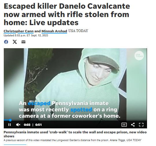 據(jù)此前報道,8月31日上午,卡瓦爾坎特從賓州切斯特縣監(jiān)獄越獄。自其越獄后,已多次被監(jiān)控拍到,也有目擊者見到過他。目前,對于提供線索幫助抓捕該逃犯的懸賞金額已達到2.5萬美元。