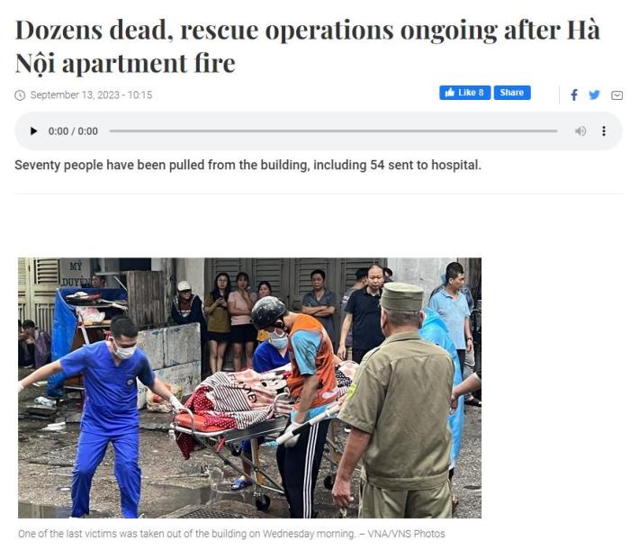 《越南新聞報(bào)》稱(chēng),目前大火已被撲滅,救援工作仍在進(jìn)行當(dāng)中。