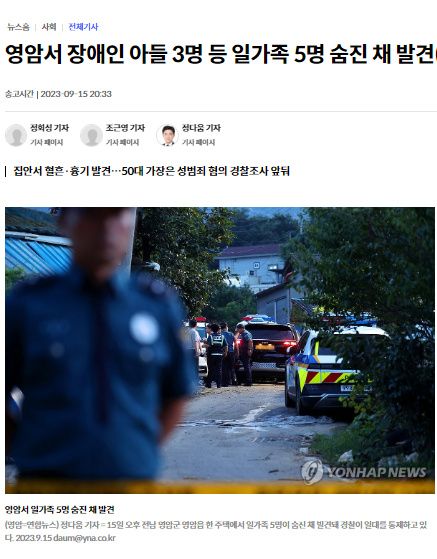 據(jù)報(bào)道,15日下午3時(shí)54分,韓國(guó)警察廳接到了關(guān)于全羅南道靈巖郡金某住宅窗戶上有血跡的報(bào)警。當(dāng)?shù)鼐脚c消防急救隊(duì)一同前往,進(jìn)入該住宅后發(fā)現(xiàn)了金某、金某妻子以及金某夫婦的三名20多歲兒子的尸體。