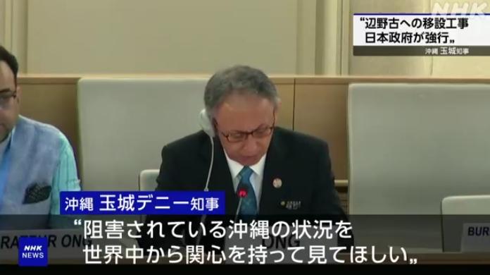 當(dāng)?shù)貢r間18日,日本沖繩縣知事玉城丹尼在瑞士日內(nèi)瓦召開的聯(lián)合國人權(quán)理事會上,抨擊美日政府不顧沖繩民眾民意強行推進(jìn)美軍基地搬遷。圖片來源:日本放送協(xié)會(NHK)視頻截圖