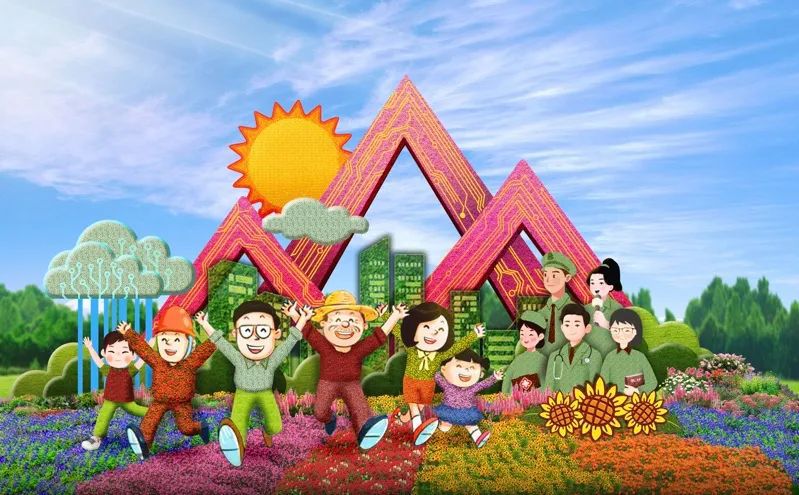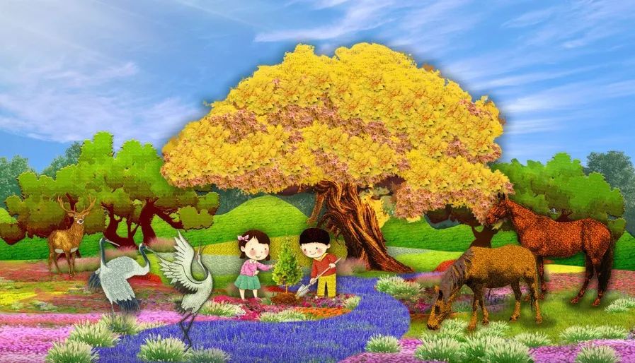 4. 東單西北角的“和諧共生”花壇頂高8.5米,以“三北工程”綠色長城為主景,配以野馬(西北)、麋鹿(華北)、白鶴(東北)、胡楊等典型物種,體現(xiàn)了生態(tài)治理的典范,寓意堅定不移走好人與自然和諧共生的中國式現(xiàn)代化之路。