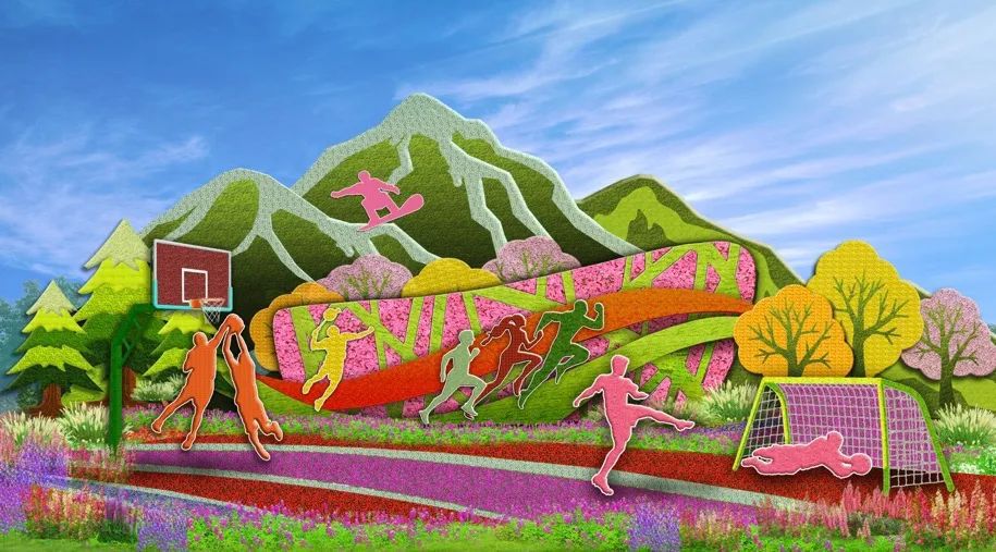 6. 西單東北角的“全民健身”花壇頂高8.5米,以豐富多彩的全民健身為題材,配以籃球、羽毛球、跑步、滑雪等運(yùn)動場景,寓意全民健身共享美好生活。
