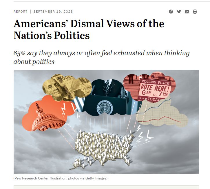 近三分之二的人(65%)表示,他們在思考政治時總是或經(jīng)常感到疲憊,而55%的人感到憤怒。相比之下,只有10%的人說他們總是或經(jīng)常對政治抱有希望。