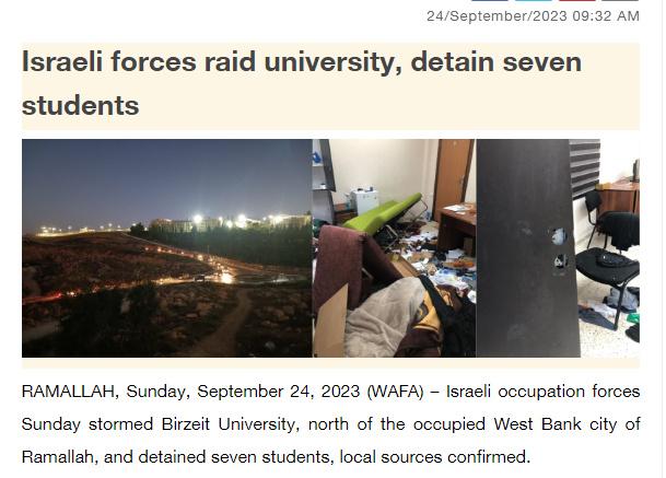 據(jù)報道,消息人士稱,以軍在突襲比爾宰特大學并破壞該校的物品和財產(chǎn)后,逮捕了7名學生,其中包括一名前囚犯。