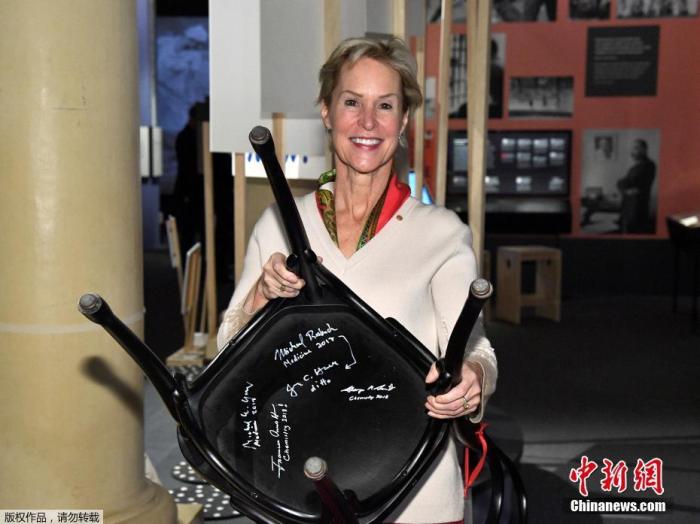 資料圖:2018年諾貝爾化學(xué)獎(jiǎng)得主弗朗西斯·阿諾德展示其簽名的椅子。