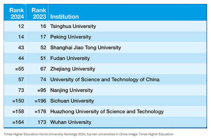 文章注意到,中國有史以來首次有兩所大學(xué)躋身世界大學(xué)排名前15。清華大學(xué)(從排名第16升至第12)和北京大學(xué)(從第17升至第14)逐步接近全球前十,超越了賓夕法尼亞大學(xué)、約翰·霍普金斯大學(xué)和哥倫比亞大學(xué)等美國一流大學(xué)。