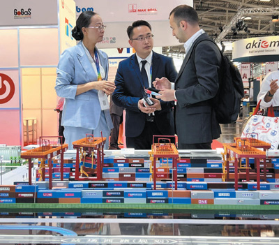 在2023年慕尼黑國(guó)際物流博覽會(huì)上,工作人員在中鐵集裝箱運(yùn)輸有限公司展臺(tái)前向國(guó)外客戶介紹廣州國(guó)際港中歐班列站點(diǎn)設(shè)施。
