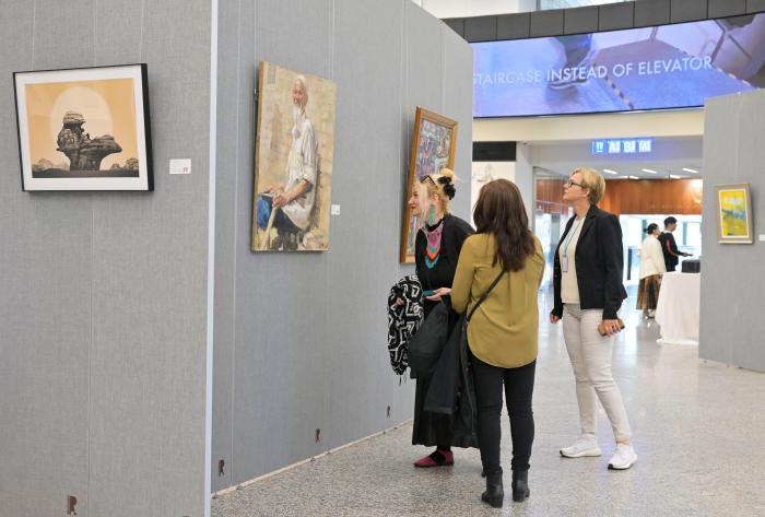各國(guó)外交官和聯(lián)合國(guó)國(guó)際職員們?cè)谛蕾p中國(guó)藝術(shù)家的作品。歐洲時(shí)報(bào)記者周修怡 攝