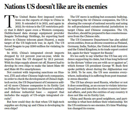美國的這一做法,是徹頭徹尾的“經(jīng)濟霸凌”。本次將42家中國企業(yè)列入“管制清單”,正是美國泛化其所謂“國家安全”概念,動用其所謂“治外法權(quán)”,打壓中國及中國企業(yè)的又一實例。這可能會引來中國的反制措施,對此美國應(yīng)做好準(zhǔn)備。
