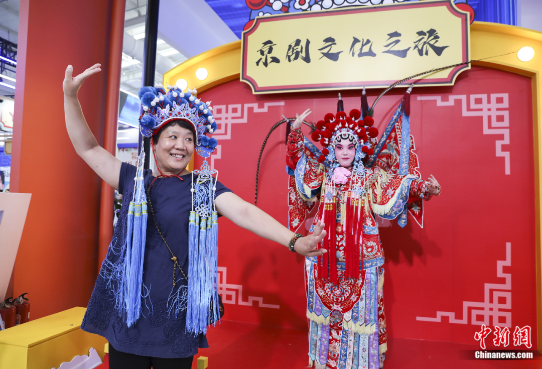 2023年中國國際服務(wù)貿(mào)易交易會(服貿(mào)會)在北京舉行,觀眾在首鋼園區(qū)“京劇文化之旅”展臺模仿京劇演員表演《穆桂英》片段。趙雋 攝