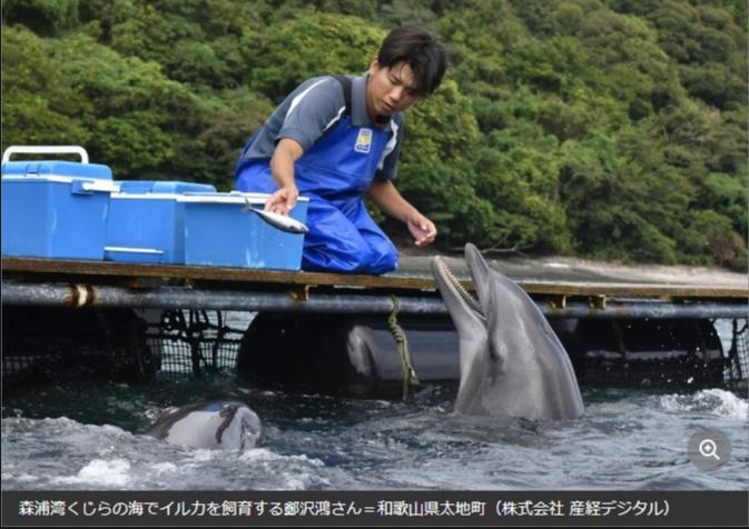 在“森浦灣鯨之?!憋曫B(yǎng)海豚的鄭澤鴻。圖片來源于《產(chǎn)經(jīng)新聞》報(bào)道截圖。