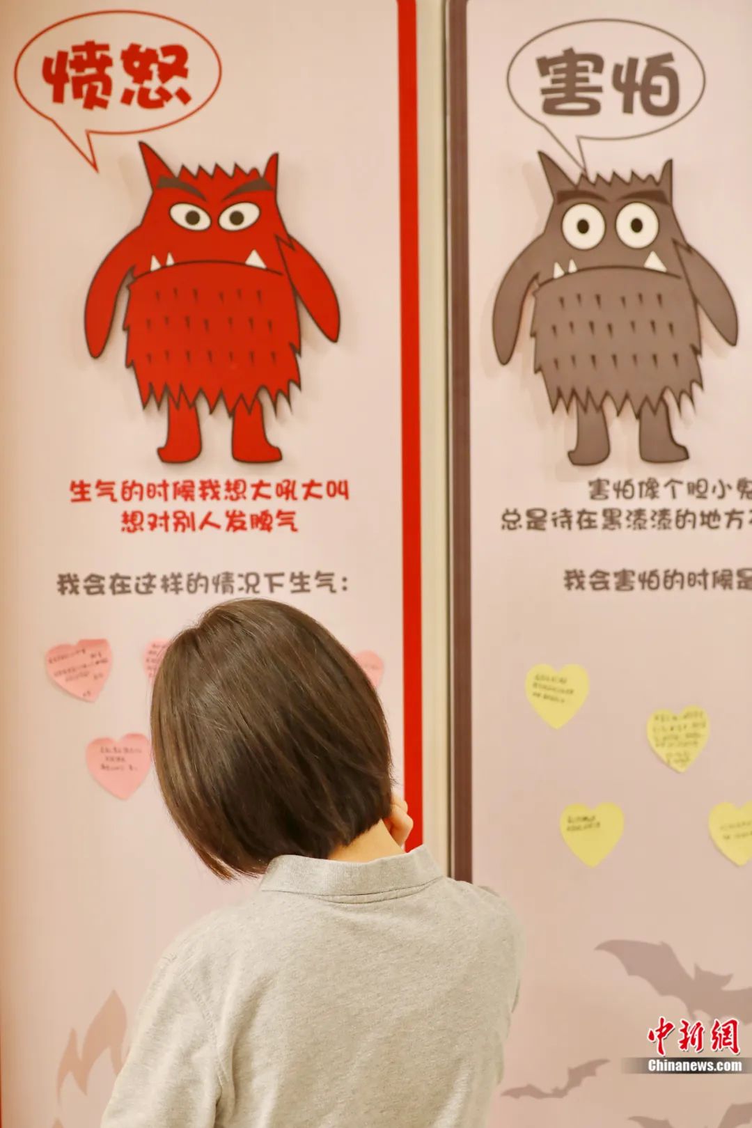 2023年5月14日,在浙江省嘉興市兒童青少年心理健康服務(wù)總站,學(xué)生在“情緒墻”上表達(dá)心聲。金鵬 攝