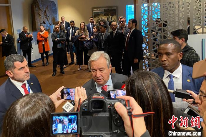 當(dāng)?shù)貢r(shí)間10月13日,聯(lián)合國(guó)秘書(shū)長(zhǎng)古特雷斯在安理會(huì)就中東局勢(shì)進(jìn)行緊急磋商后,在紐約聯(lián)合國(guó)總部回答記者提問(wèn)?!≈行律缬浾?王帆 攝