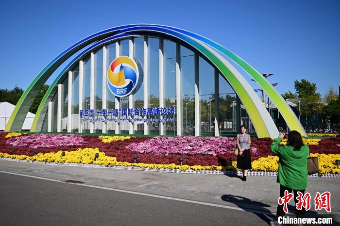 10月15日,北京,工作人員在國家會議中心外的第三屆“一帶一路”國際合作高峰論壇景觀布置前拍照留念。當(dāng)日,位于國家會議中心的第三屆“一帶一路”國際合作高峰論壇新聞中心啟動試運(yùn)行?!≈行律缬浾?田雨昊 攝
