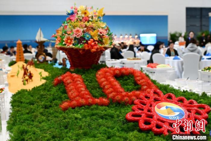 論壇新聞中心大門兩側(cè)擺放著兩塊主題燈光展板,走近細(xì)看,航行在大海中的帆船、在沙漠中行走的駱駝、“一帶一路”共建國家標(biāo)志性建筑物等多個具有象征意義的圖案細(xì)節(jié)盡在其中。在餐廳中央取餐臺上,代表著共建“一帶一路”倡議10周年的數(shù)字“10”,和祈年殿等中國古建筑物代表性元素也都精妙地融于一體。