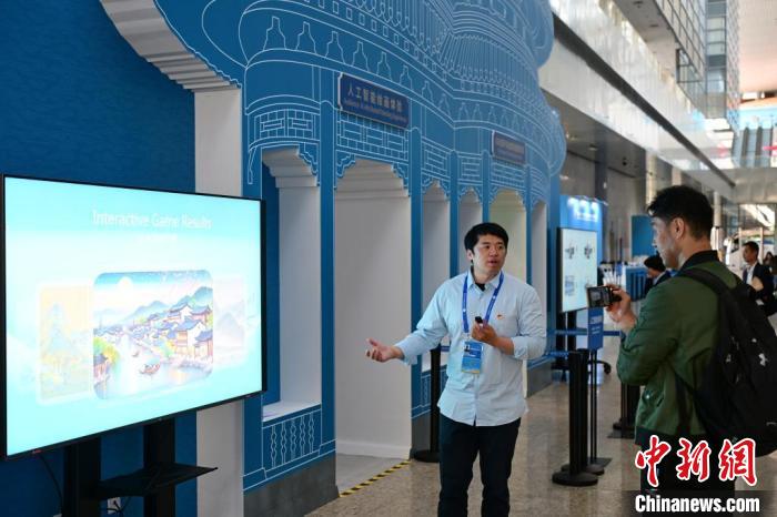 在人工智能繪畫和動畫體驗區(qū),體驗者只需在現(xiàn)場觸控屏前隨意勾畫線條輪廓,智能引擎將據(jù)此生成意境超拔的山水畫卷,讓觀眾體驗前沿科技與傳統(tǒng)繪畫交融之趣。體驗區(qū)內(nèi)的智能引擎還可建構(gòu)虛擬人物,生成動畫短片暢游打卡勝地,讓體驗者置身于古都風(fēng)貌和現(xiàn)代生活。