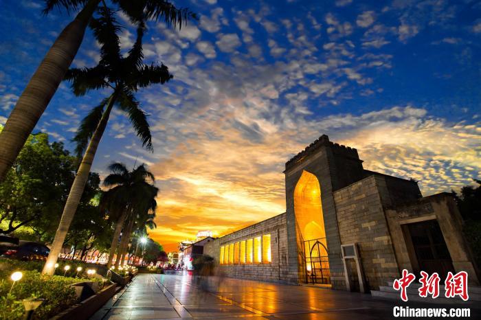 在古代海上絲綢之路的起點(diǎn)城市——福建泉州,當(dāng)落日余暉灑落于清凈寺前的廣場(chǎng),披上霞裝的千年古寺散發(fā)出濃郁的異域風(fēng)情。