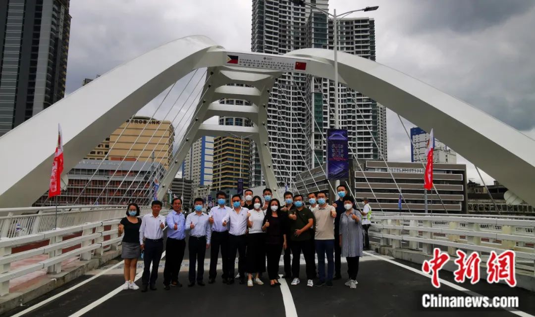 2022年4月6日,中國(guó)駐菲使館部分館員和中國(guó)駐菲企業(yè)、機(jī)構(gòu)工作人員,登上新落成的中國(guó)援建菲律賓馬尼拉B-I大橋合影留念。中國(guó)駐菲律賓大使館 供圖