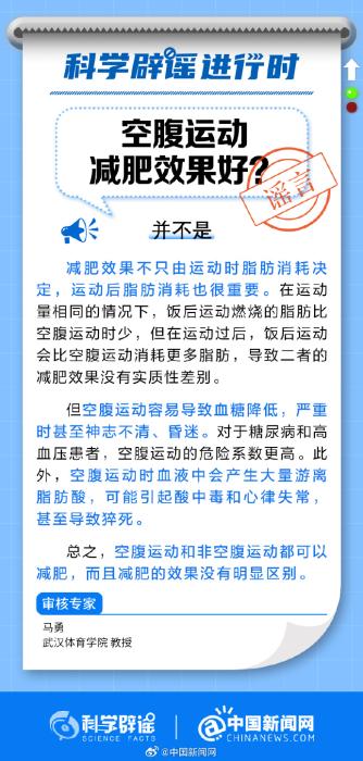中新網(wǎng)10月24日電 空腹運(yùn)動(dòng)和非空腹運(yùn)動(dòng)都可以減肥,且減肥的效果沒(méi)有明顯區(qū)別。但空腹運(yùn)動(dòng)容易導(dǎo)致血糖降低,嚴(yán)重時(shí)會(huì)造成神志不清、昏迷。對(duì)于糖尿病和高血壓患者,空腹運(yùn)動(dòng)的危險(xiǎn)系數(shù)更高。此外,空腹運(yùn)動(dòng)時(shí)血液中會(huì)產(chǎn)生大量游離脂肪酸,可能引起酸中毒和心律失常,甚至導(dǎo)致猝死。(來(lái)源:@科學(xué)辟謠 @中國(guó)新聞網(wǎng) )