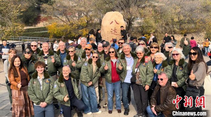 10月29日,美國(guó)飛虎隊(duì)老兵哈里·莫耶、飛虎隊(duì)指揮官陳納德將軍的外孫女尼爾·凱樂(lè)威以及一眾飛虎隊(duì)老兵家屬在北京八達(dá)嶺長(zhǎng)城景區(qū)合影留念。中新社記者郭超凱 攝