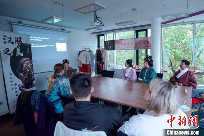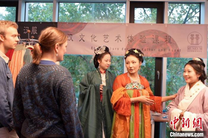 圖為活動講師為德國學(xué)生介紹漢制漢服特點(diǎn)。漢文化藝術(shù)交流中心供圖。