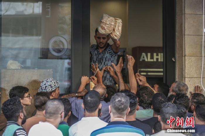 當(dāng)?shù)貢r間10月17日,加沙地帶南部城市汗尤尼斯,巴勒斯坦公民聚集在一家面包店前搶購面包。