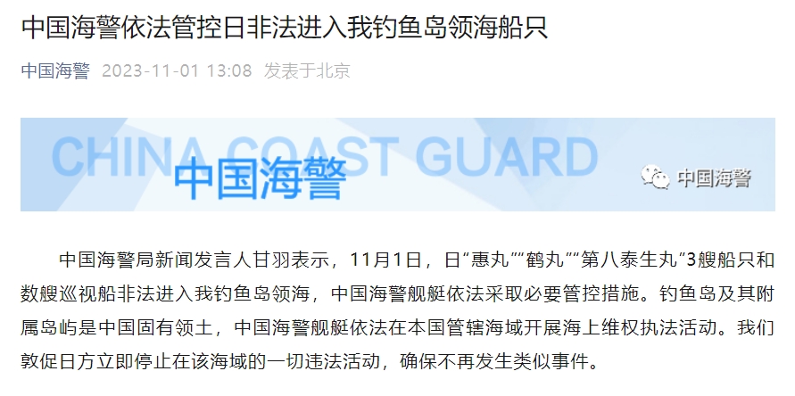 中新網(wǎng)11月1日電 據(jù)中國海警微博消息,中國海警局新聞發(fā)言人甘羽表示,11月1日,日“惠丸”“鶴丸”“第八泰生丸”3艘船只和數(shù)艘巡視船非法進入我釣魚島領海,中國海警艦艇依法采取必要管控措施。釣魚島及其附屬島嶼是中國固有領土,中國海警艦艇依法在本國管轄海域開展海上維權執(zhí)法活動。我們敦促日方立即停止在該海域的一切違法活動,確保不再發(fā)生類似事件。