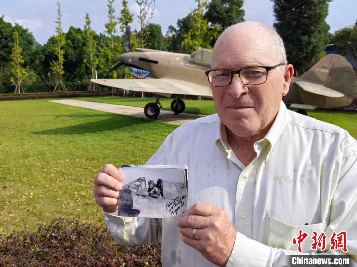 11月4日,在廣西柳州市飛虎隊(duì)遺址里,飛虎隊(duì)后代小克利福德·隆在一架復(fù)刻的戰(zhàn)機(jī)前展示父親的照片。劉俊聰 攝