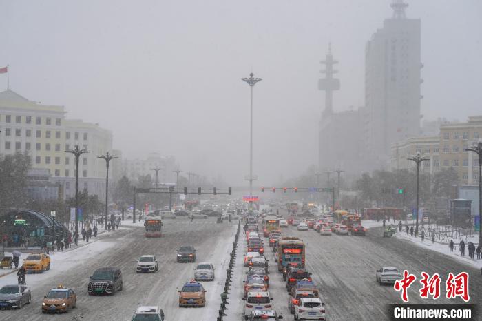 11月6日,哈爾濱市迎來暴雪天氣,車輛在結(jié)冰的路面上蝸行。趙宇航 攝
