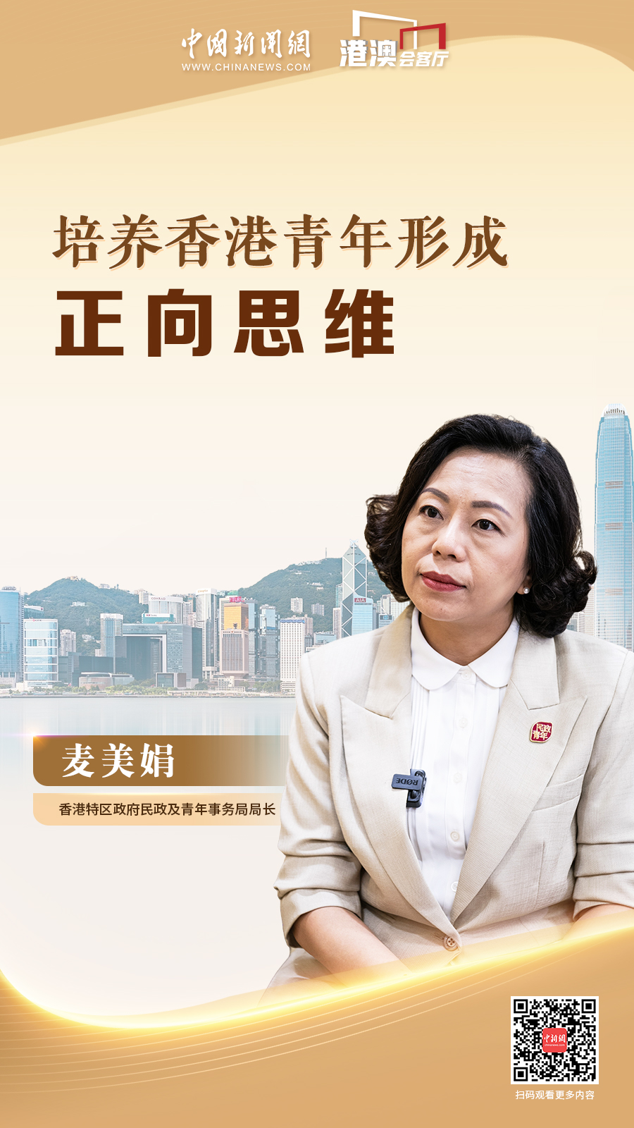 香港特區(qū)政府民政及青年事務局局長麥美娟近日接受中國新聞網“港澳會客廳”欄目專訪時表示,要培養(yǎng)香港青年形成正向思維。