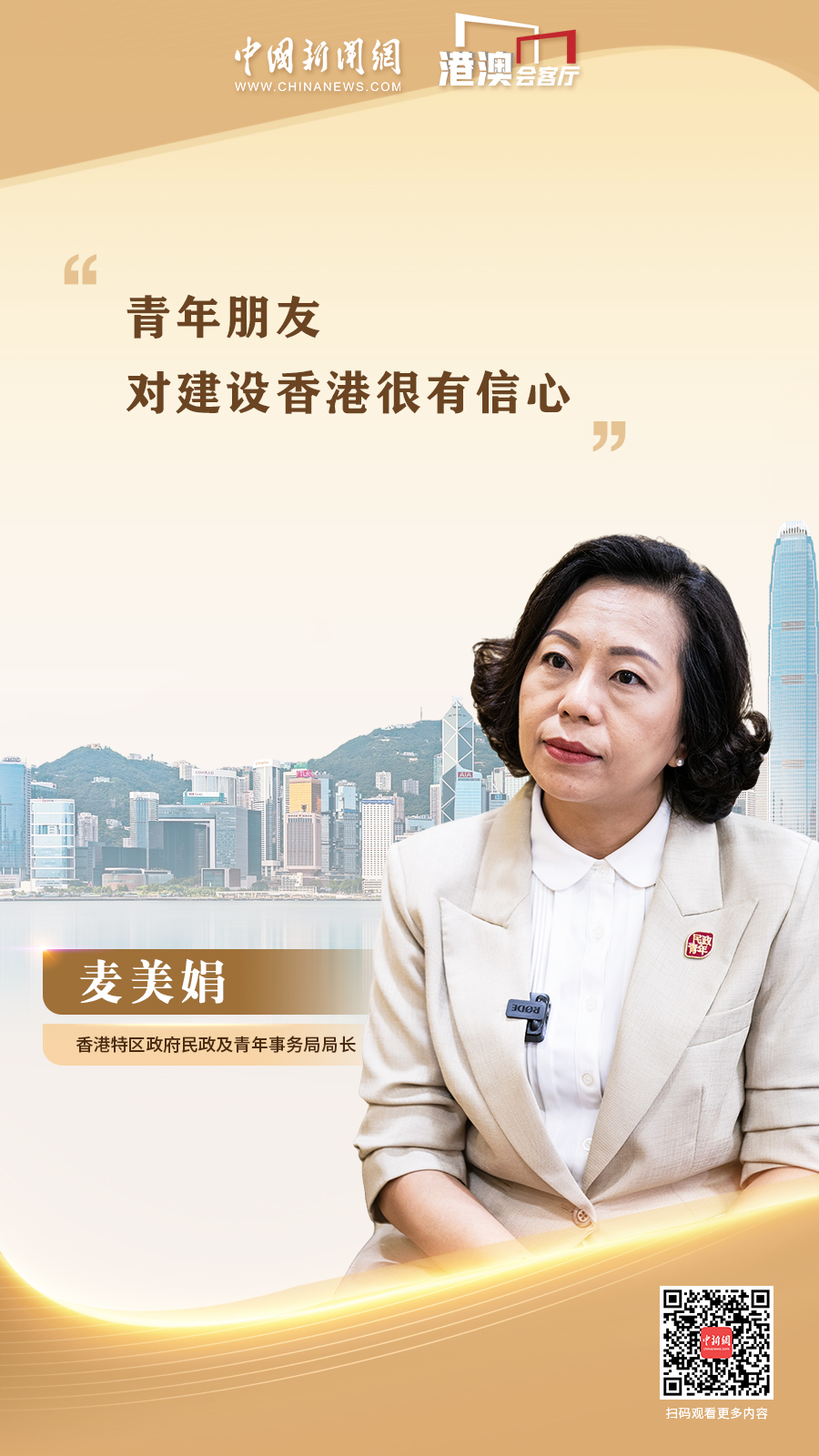 香港特區(qū)政府民政及青年事務局局長麥美娟近日接受中國新聞網“港澳會客廳”欄目專訪時表示,青年朋友對建設香港很有信心。