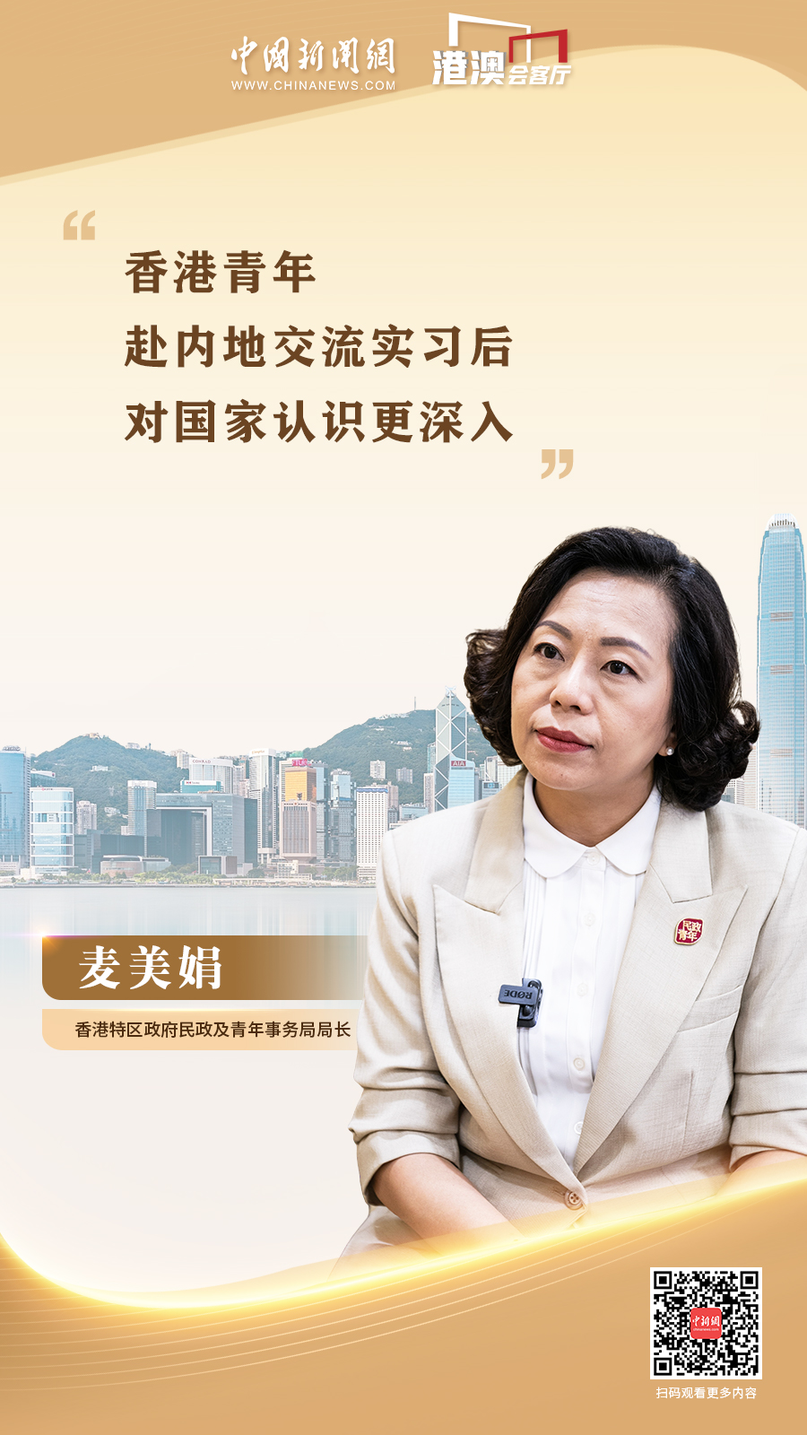 香港特區(qū)政府民政及青年事務局局長麥美娟近日接受中國新聞網“港澳會客廳”欄目專訪時表示,香港青年赴內地交流實習后對國家認識更深入。