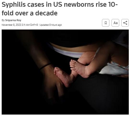 據報道,當天,美國疾病控制和預防中心報告顯示,2012年新生兒梅毒病例僅為330多例2022年這一數字升至3761例,增長了10倍多,為30多年來最高值。