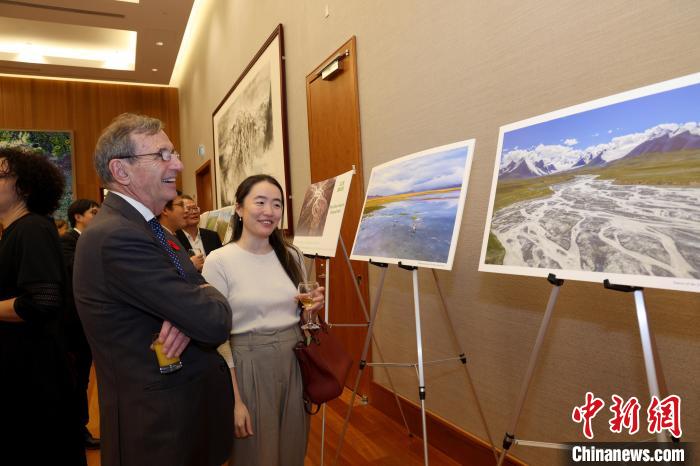 當地時間11月8日,中國駐加拿大使館舉辦國家公園圖片展暨招待會。圖為與會嘉賓觀看三江源國家公園照片。 中新社記者 余瑞冬 攝