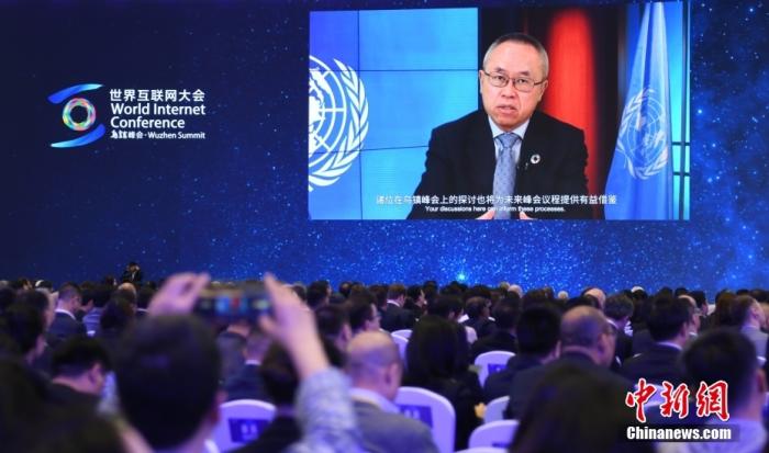 2023年11月8日,2023年世界互聯(lián)網(wǎng)大會烏鎮(zhèn)峰會在浙江烏鎮(zhèn)開幕,主題為“建設(shè)包容、普惠、有韌性的數(shù)字世界——攜手構(gòu)建網(wǎng)絡(luò)空間命運共同體”。圖為聯(lián)合國副秘書長李軍華視頻演講。