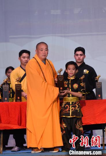 當?shù)貢r間11月12日下午,由中國嵩山少林寺主辦的“不朽少林”少林功夫公演在已有逾百年歷史的美國洛杉磯Million Dollar劇院舉行。圖為嵩山少林寺方丈釋永信向“北美洲少林考功大賽”獲獎者頒獎?!≈行律缬浾? 張朔 攝