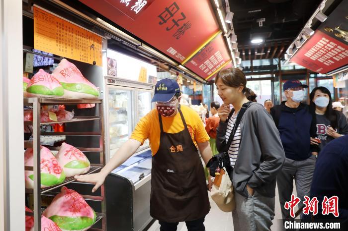 正式開張首日,各攤商早早地布置好店面。記者在市場一樓看到,立家湖州粽店的粽子等美食香氣四溢,購買民眾排起長隊(duì);合興糕團(tuán)店的巨大壽桃上有“?!薄暗摗薄吧湛鞓贰钡茸郑櫩团恼?;大連食品店整齊擺著各類堅(jiān)果,并掛著湖南臘腸、廣東臘肉等熟食。