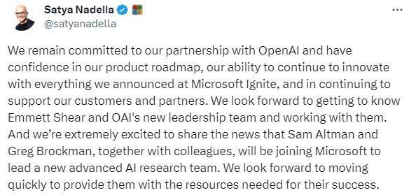 據(jù)路透社20日?qǐng)?bào)道,微軟CEO納德拉在社交媒體上發(fā)文稱(chēng),微軟仍然致力于與OpenAI的合作,并期待了解希爾領(lǐng)導(dǎo)的新團(tuán)隊(duì)。同時(shí)納德拉宣布,阿爾特曼、OpenAI前總裁格雷格·布羅克曼及其同事將加入微軟,領(lǐng)導(dǎo)一個(gè)新的高級(jí)人工智能研究團(tuán)隊(duì)。微軟期待著迅速采取行動(dòng),為其成功提供所需的資源。