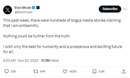 據(jù)報(bào)道,馬斯克在社交媒體平臺(tái)X上寫道,“過去一周,有數(shù)百個(gè)虛假的媒體報(bào)道聲稱我是反猶太主義者。事實(shí)并非如此。我只希望人類一切都好,所有人都有一個(gè)繁榮和令人興奮的未來?!?/p>