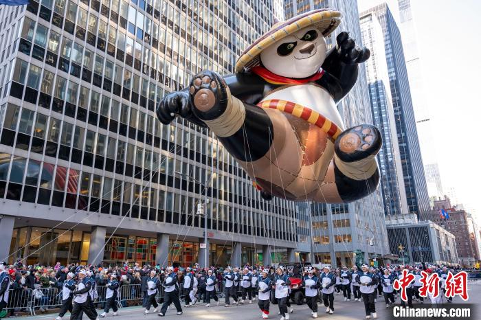 當?shù)貢r間11月23日,第97屆梅西百貨感恩節(jié)大游行在美國紐約曼哈頓舉行。圖為基于動畫電影《功夫熊貓》里阿寶的造型設(shè)計的巨型氣球行進在曼哈頓街頭?!≈行律缬浾?王帆 攝