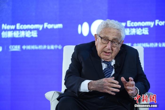 資料圖為2019年11月21日,2019年創(chuàng)新經(jīng)濟論壇在北京舉行,在“特別會議—對話:基辛格博士”環(huán)節(jié),美國前國務卿、創(chuàng)新經(jīng)濟論壇名譽主席亨利·基辛格(Henry Kissinger)出席并發(fā)言。