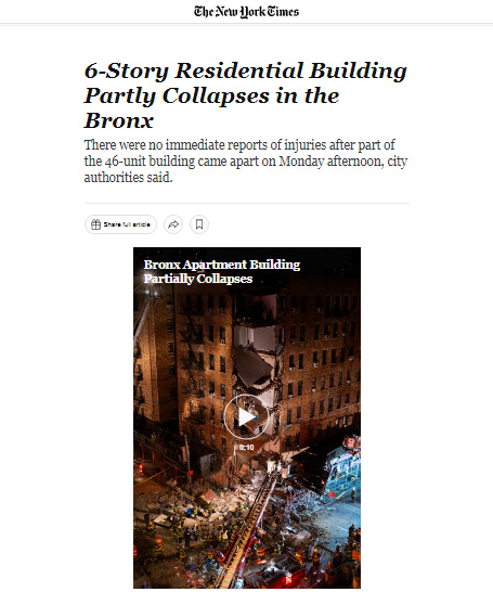 中新網(wǎng)12月12日電 據(jù)《紐約時(shí)報(bào)》報(bào)道,當(dāng)?shù)貢r(shí)間11日下午,美國紐約市布朗克斯區(qū)一棟建筑發(fā)生部分坍塌,目前暫無人員傷亡報(bào)告。