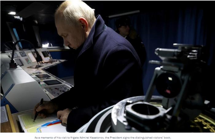 據(jù)塔斯社報(bào)道,普京在貴賓簿上寫道,“有這樣的水兵、這樣的艦艇和這樣的武器,俄羅斯會感到安全”。