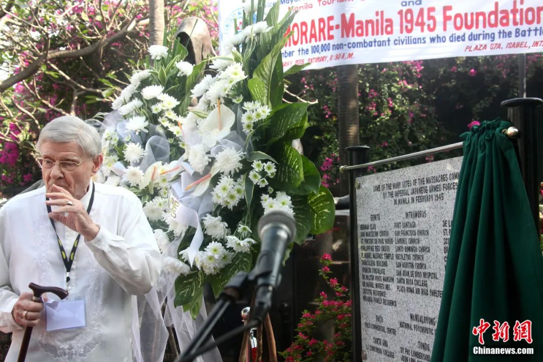 2015年2月14日,菲律賓“銘記馬尼拉1945基金會(huì)”在馬尼拉舉辦活動(dòng),紀(jì)念馬尼拉戰(zhàn)役70周年。圖為與會(huì)人士揭開(kāi)記載日軍在馬尼拉多處實(shí)施大屠殺地點(diǎn)的牌匾。張明 攝