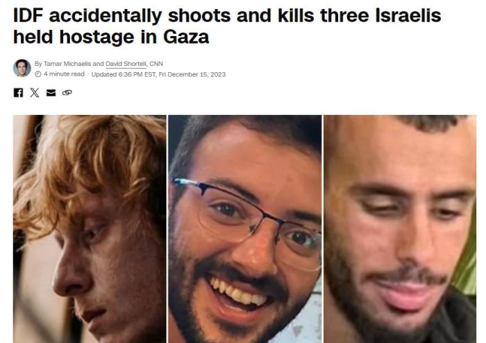 據(jù)美國有線電視新聞網(wǎng)(CNN)報(bào)道,以色列國防軍發(fā)言人赫格里在新聞發(fā)布會(huì)上表示,“在謝賈亞的戰(zhàn)斗中,以色列國防軍錯(cuò)誤地將三名以方人質(zhì)視為威脅。軍隊(duì)向其開火,他們被打死?!?/p>