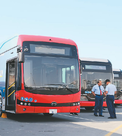 中國品牌的電動車停放在COP28的擺渡車停車場。COP28開幕以來,中國品牌的電動車為本次氣候大會提供服務,增添了一道靚麗的風景線。