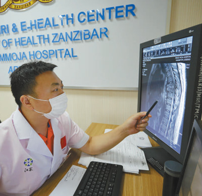 從第一臺(tái)X光機(jī)、CT設(shè)備,再到目前整個(gè)桑給巴爾地區(qū)唯一一臺(tái)核磁共振機(jī),納茲莫加醫(yī)院影像科的設(shè)備物資都來自中國捐贈(zèng)。不久前,影像科還增添了遠(yuǎn)程視頻設(shè)備。通過遠(yuǎn)程技術(shù),中國醫(yī)療隊(duì)可以對接中國國內(nèi)優(yōu)質(zhì)醫(yī)療資源,對當(dāng)?shù)貜?fù)雜病例進(jìn)行在線會(huì)診。桑給巴爾地區(qū)現(xiàn)有的5名影像科醫(yī)生,就是在一批批中國醫(yī)療隊(duì)隊(duì)員的帶教下成長起來的。